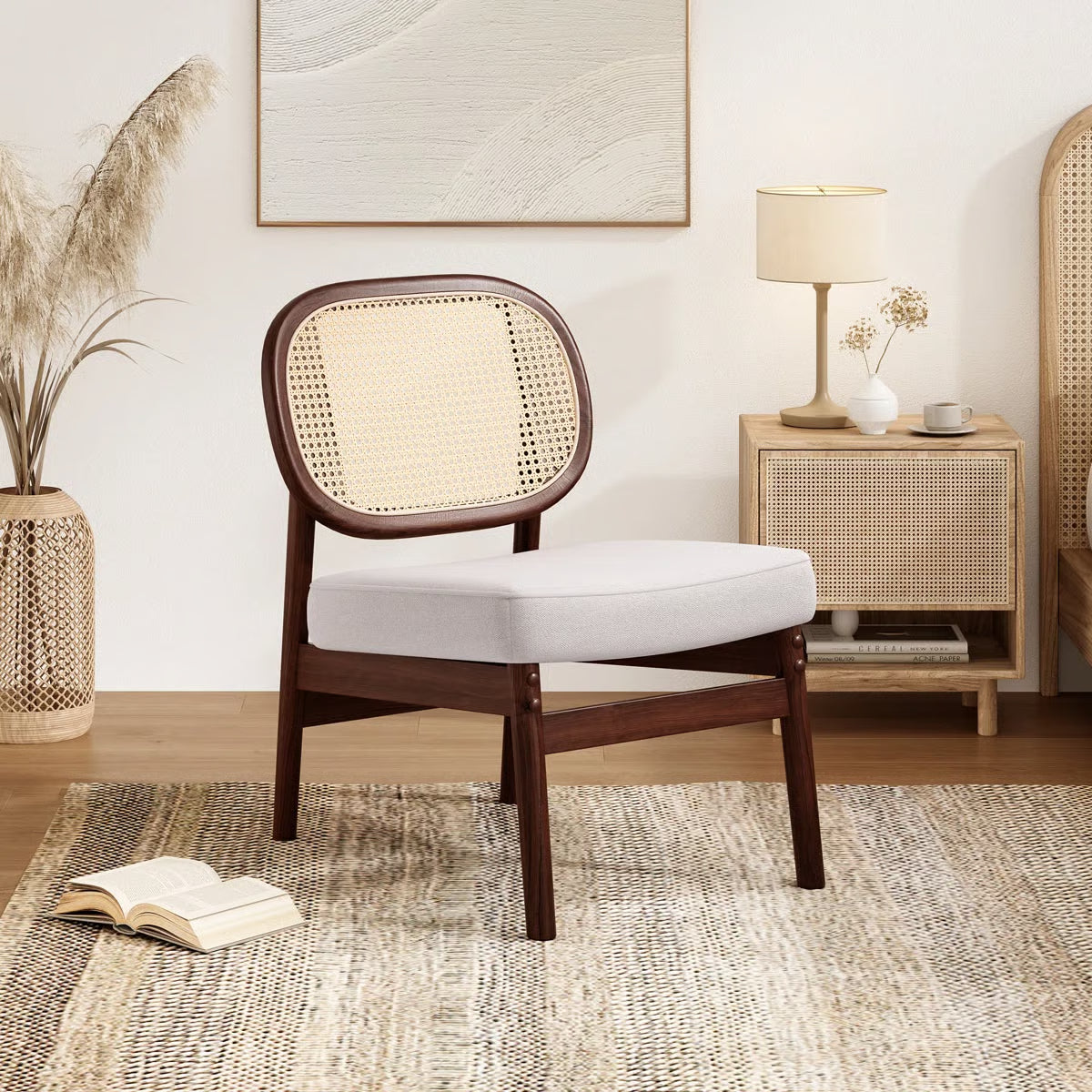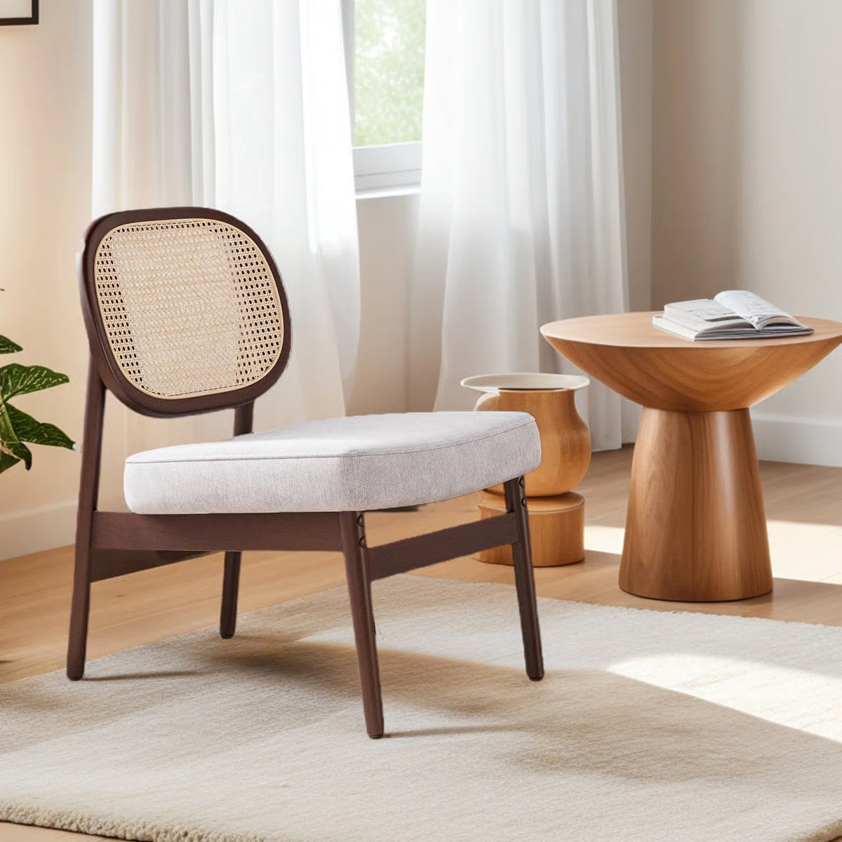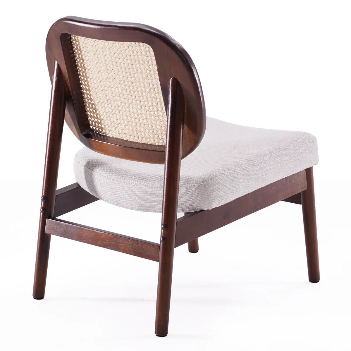 Bring a blend of natural charm and modern comfort into your home with the Morwenna Accent Chair – Beige/Brown. Designed with a distinctive rattan cane backrest and a solid beech wood frame finished in walnut, this chair adds a touch of mid-century elegance to any living space. Its armless silhouette provides a sleek, versatile look, making it a stylish addition to living rooms, reading corners, or bedrooms.