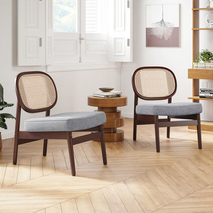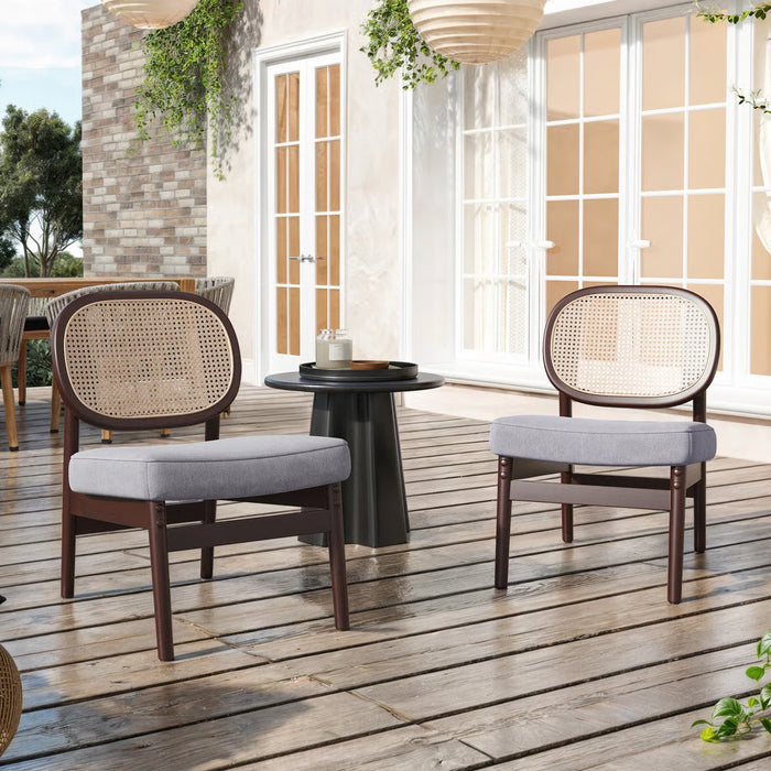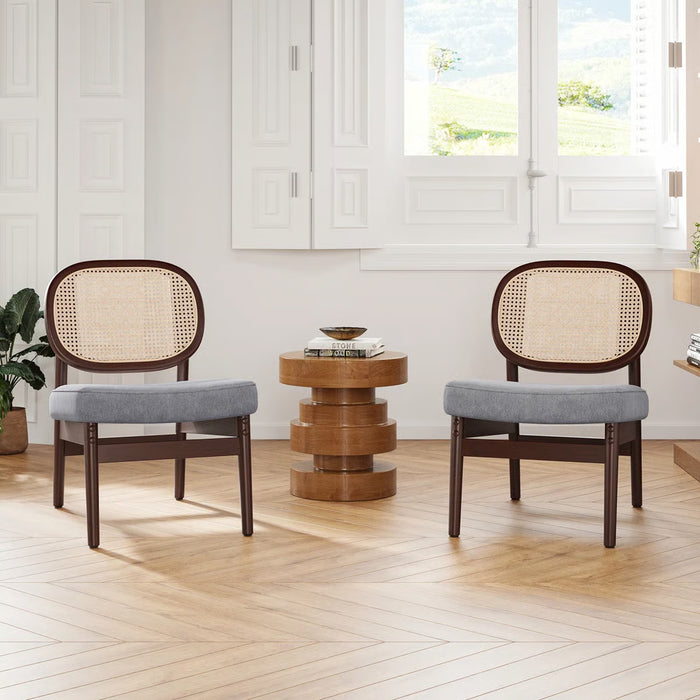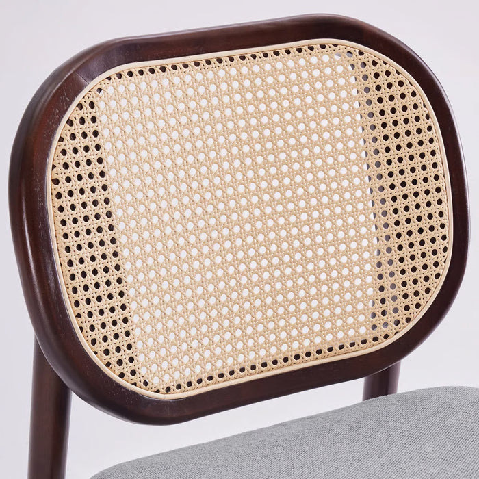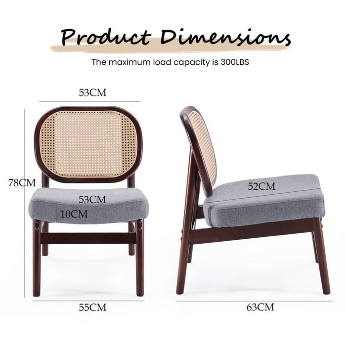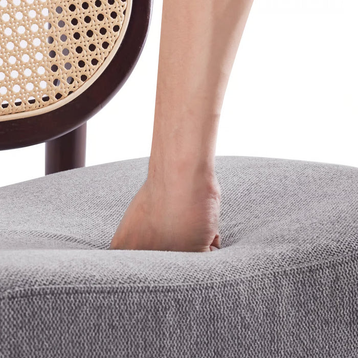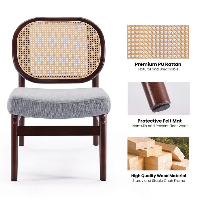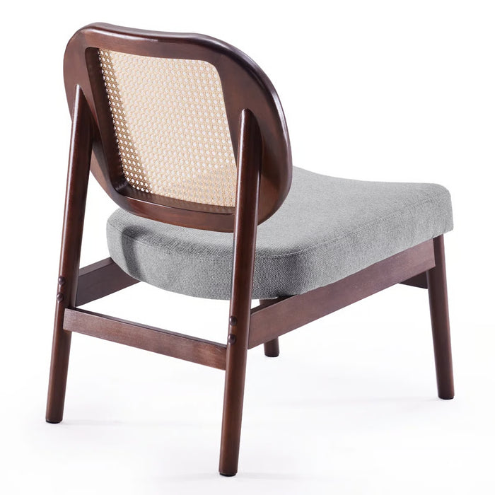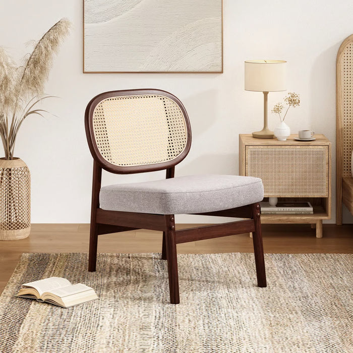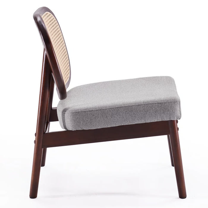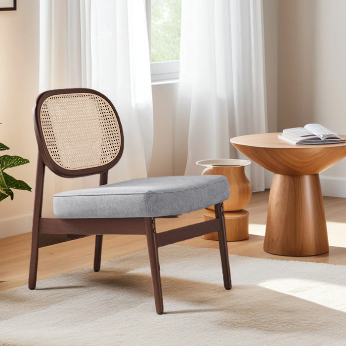 Bring a blend of natural charm and modern comfort into your home with the Morwenna Accent Chair – Dark Grey/Brown. Designed with a distinctive rattan cane backrest and a solid beech wood frame finished in walnut, this chair adds a touch of mid-century elegance to any living space. Its armless silhouette provides a sleek, versatile look, making it a stylish addition to living rooms, reading corners, or bedrooms.