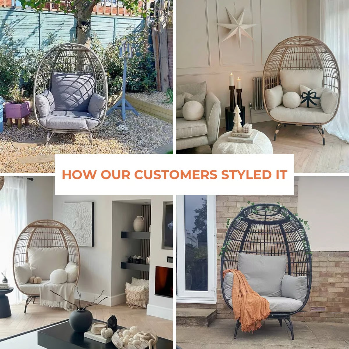 Create your own cozy retreat with the Devon Egg Chair Rattan Style. Perfect for lounging in the garden, patio, or sunroom, this egg-shaped chair combines comfort and style in one. Its handwoven PE resin rattan design brings a contemporary touch, while the thick cushions offer plush support for hours of relaxation. With its spacious size and modern aesthetic, it’s an inviting piece for curling up with a book, sipping a cocktail, or simply soaking up the sunshine.