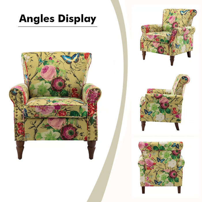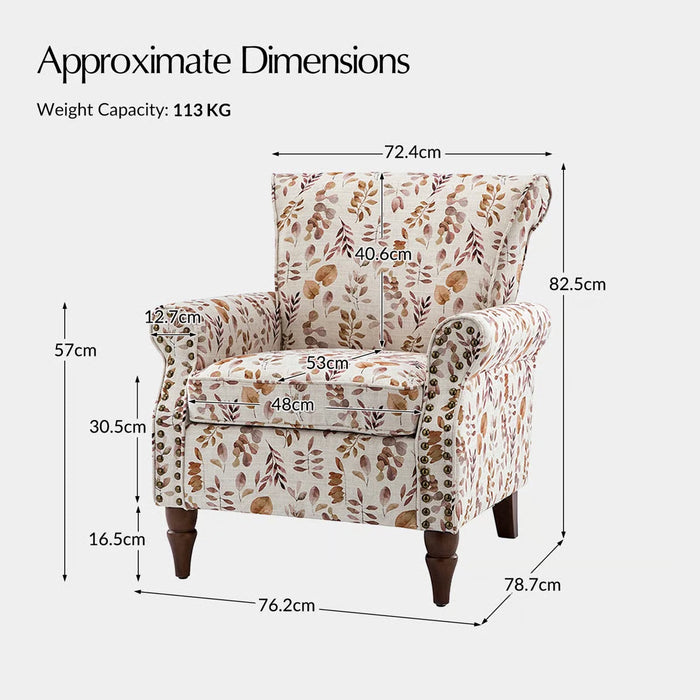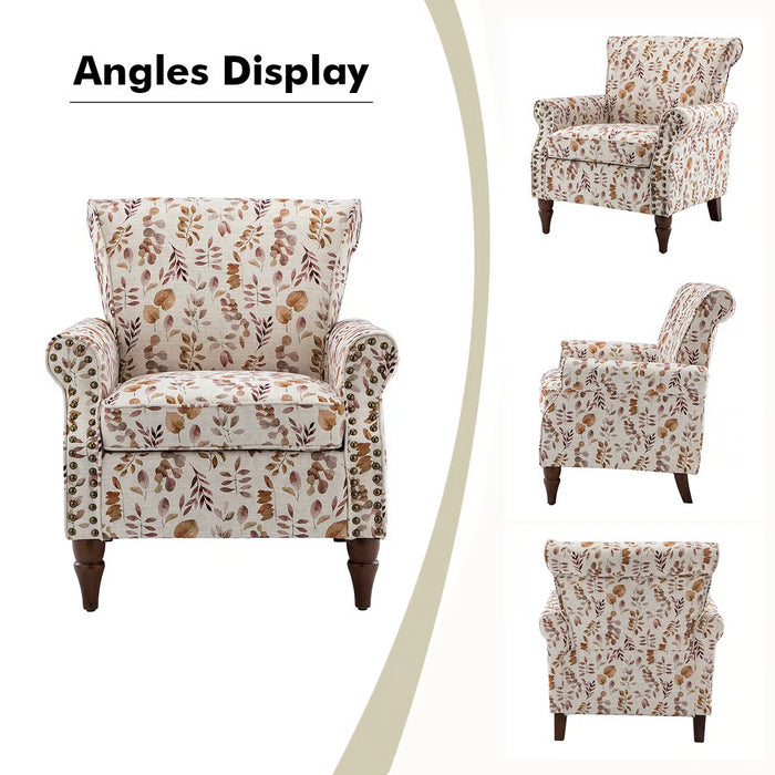 Bring charm and elegance to your living space with the Fenella Floral Upholstered Accent Armchair. Designed to be the focal point of any room, this chair combines classic craftsmanship with an artistic flair. The rolled arms, scrolled back, and glamorous nailhead trim create a timeless silhouette, while the eye-catching floral pattern in rich tones adds personality and warmth.
