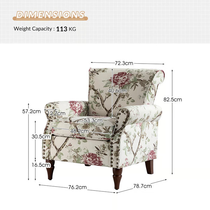 Features: • Colour: White • Material: Manufactured Wood, Polyester, Foam • Dimensions: 78.7 x 76.2 x 82.5 cm (D x W x H) • Seat Size: 53 x 48 cm (W x D) • Seat Height: 47 cm • Weight Capacity: 113.4kg / 250 lbs • Classic rolled arms and scrolled backrest for a timeless look. • Artistic floral upholstery that makes a bold design statement. • Ideal for living rooms, bedrooms, study room • Assembly required: Yes