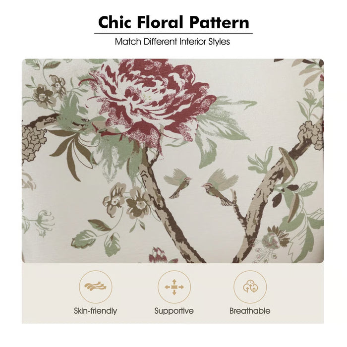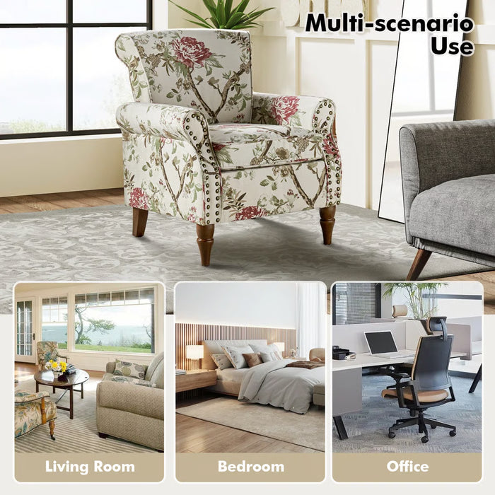 Bring charm and elegance to your living space with the Fenella Floral Upholstered Accent Armchair. Designed to be the focal point of any room, this chair combines classic craftsmanship with an artistic flair. The rolled arms, scrolled back, and glamorous nailhead trim create a timeless silhouette, while the eye-catching floral pattern in rich tones adds personality and warmth.