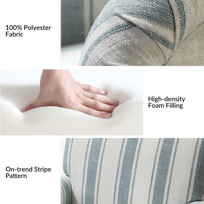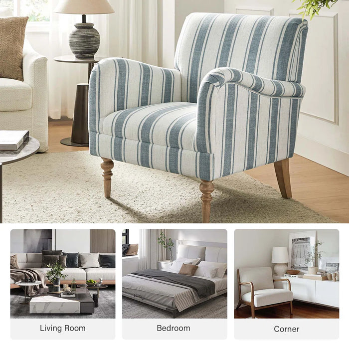Bring timeless charm and comfort into your home with the Lily Classic Striped Upholstered Accent Chair. Designed in a blend of classic and contemporary style, this accent chair features a slightly slanted backrest, flared arms, and retro-inspired legs that add a touch of elegance to any space. Upholstered in premium 100% polyester fabric with a striking blue and white stripe pattern, it provides both durability and visual appeal.