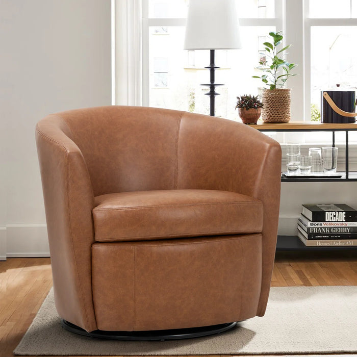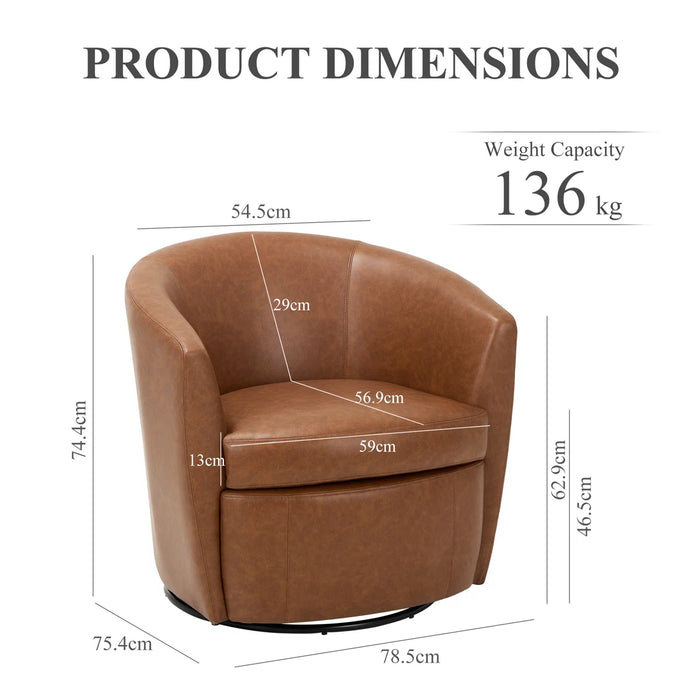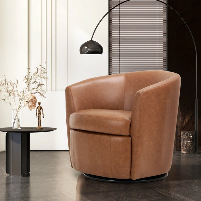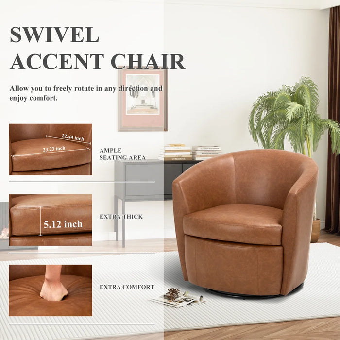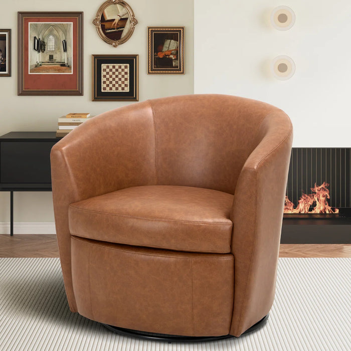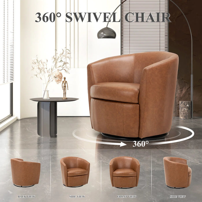 The Perrin Swivel Barrel Accent Chair – Brown is where comfort meets contemporary style. Wrapped in premium faux leather upholstery with elegant stitched detailing, this chair offers a sophisticated touch to any modern living room, office, or lounge area. Its barrel silhouette embraces you with supportive cushioning, while the smooth, rounded contours elevate the design with timeless appeal.