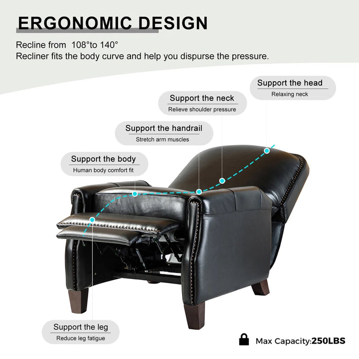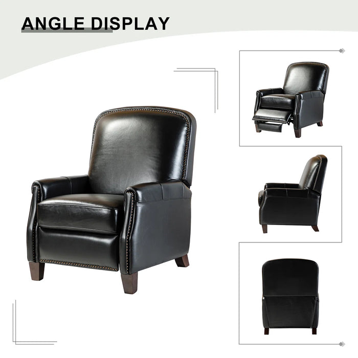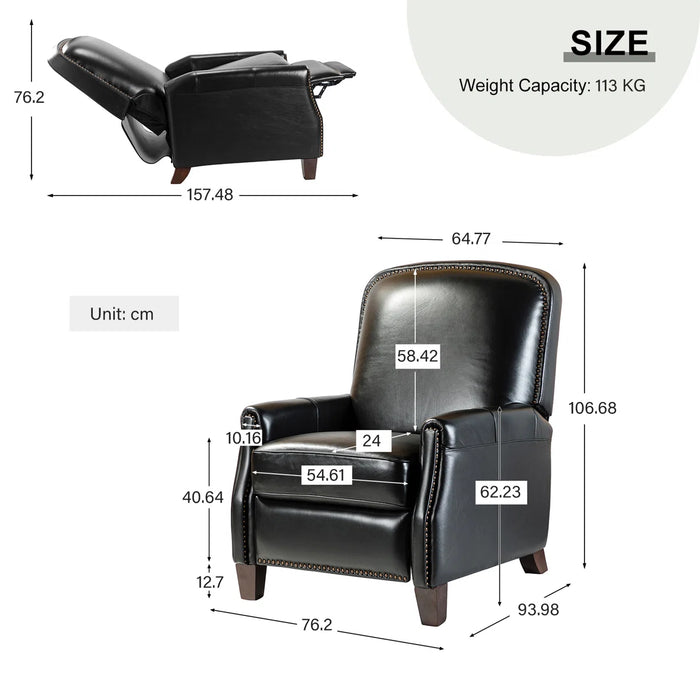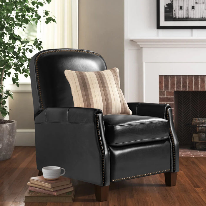 The Rocky Classic Genuine Leather Recliner blends timeless design with everyday comfort, making it the perfect addition to any living space. Upholstered in luxurious top-grain leather with elegant nailhead trim, this club-style chair offers a sophisticated look while ensuring durability and support. Its solid wood frame, plush foam-filled cushions, and smooth push-back reclining mechanism create an inviting spot to unwind—whether you’re reading, watching TV, or simply relaxing after a long day.
