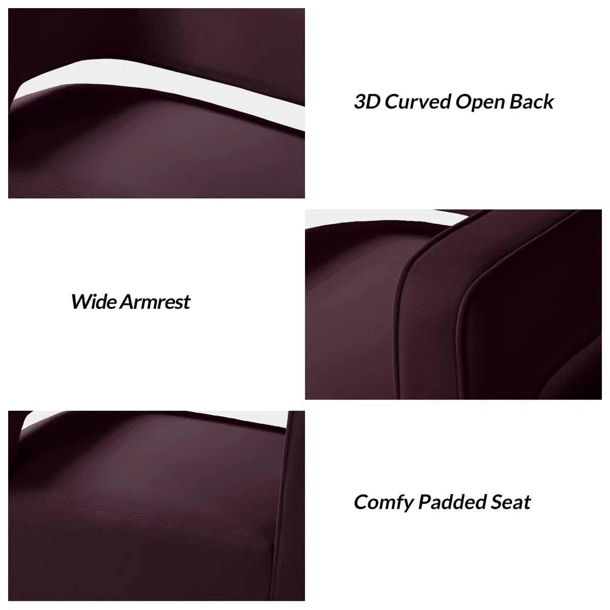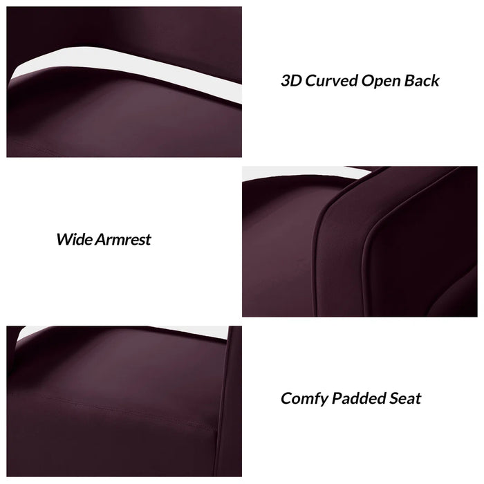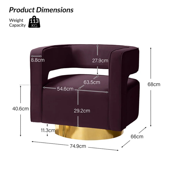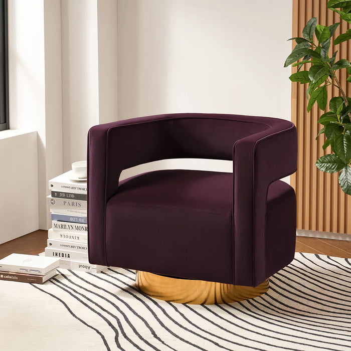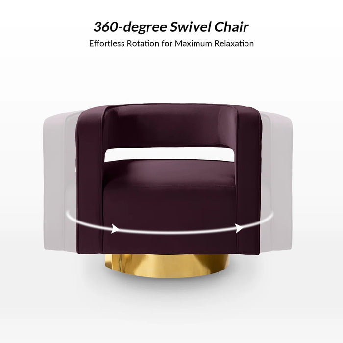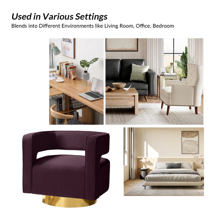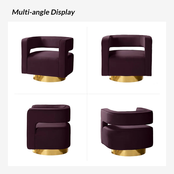 Bring a touch of modern glamour to your home with the Samantha Velvet Upholstered Barrel Chair - Purple. Designed with a sleek barrel silhouette, this chair rests on a circular swivel base finished in a luxurious gold tone, adding a chic and contemporary flair to any space. Upholstered in soft velvet, it offers both style and comfort, while the high-density foam filling and sinuous spring seat construction provide excellent support for long-lasting use.