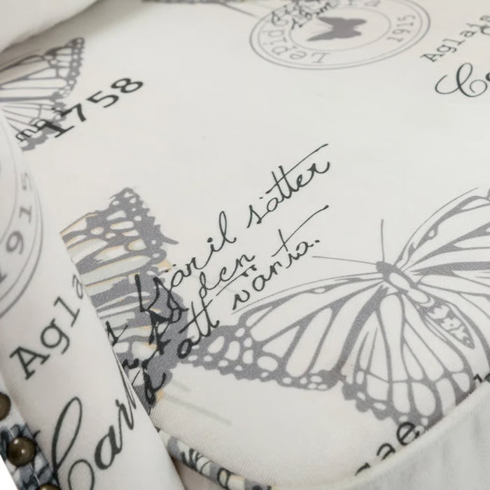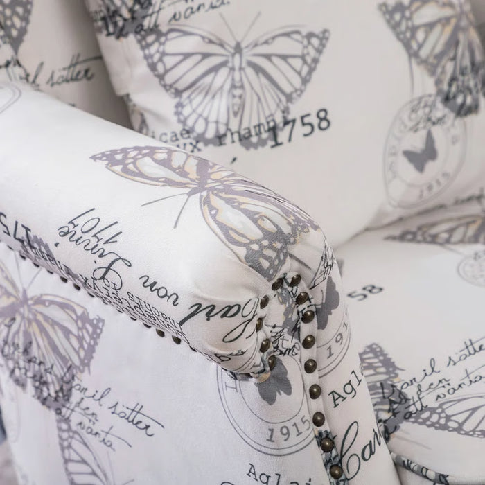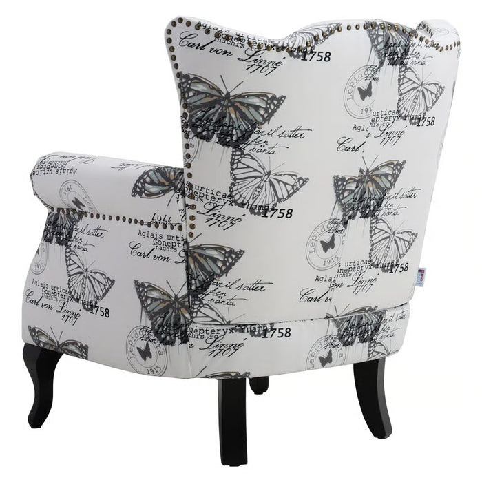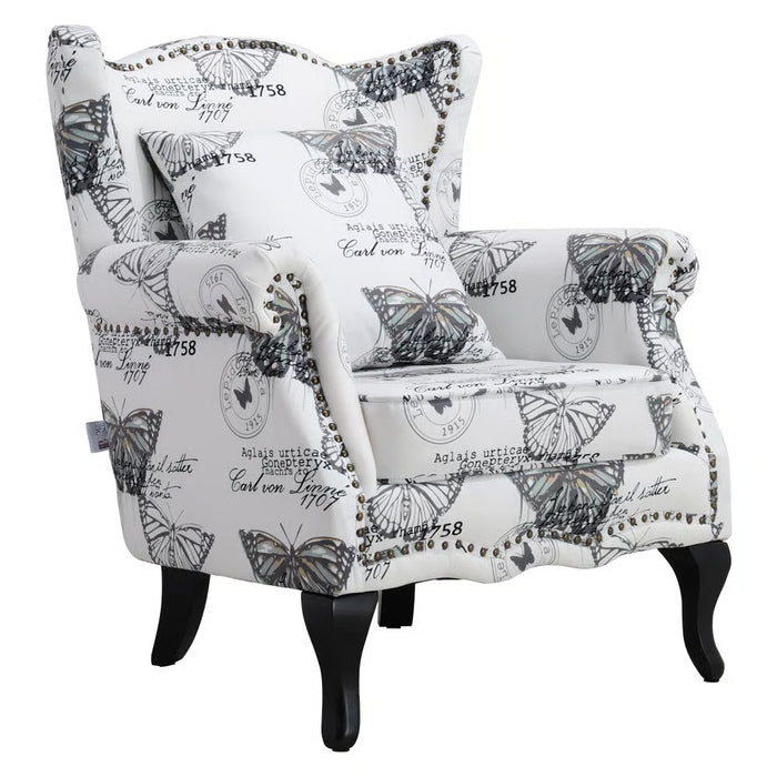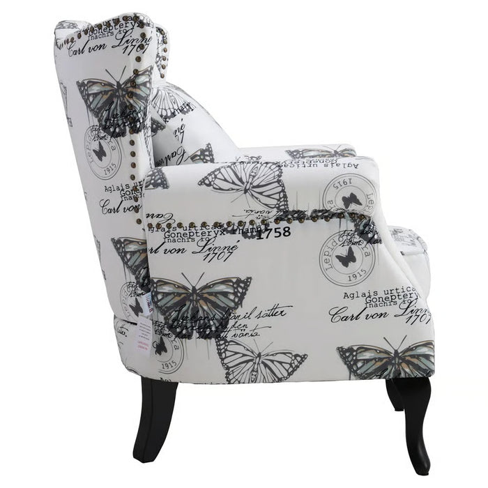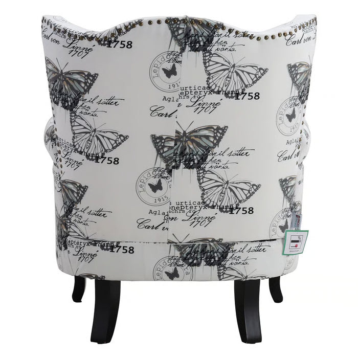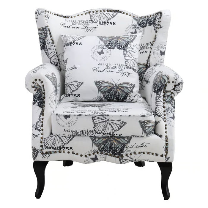 Bring timeless charm and artistic flair into your home with the Selena Butterfly Upholstered Wingback Chair – White/Black. Featuring a striking butterfly print, this chair blends elegance with a playful touch of mid-century transitional design. Its tall, tight back and gracefully flared arms create a classic wingback silhouette, making it the perfect statement piece for your living room, reading corner, or bedroom retreat.