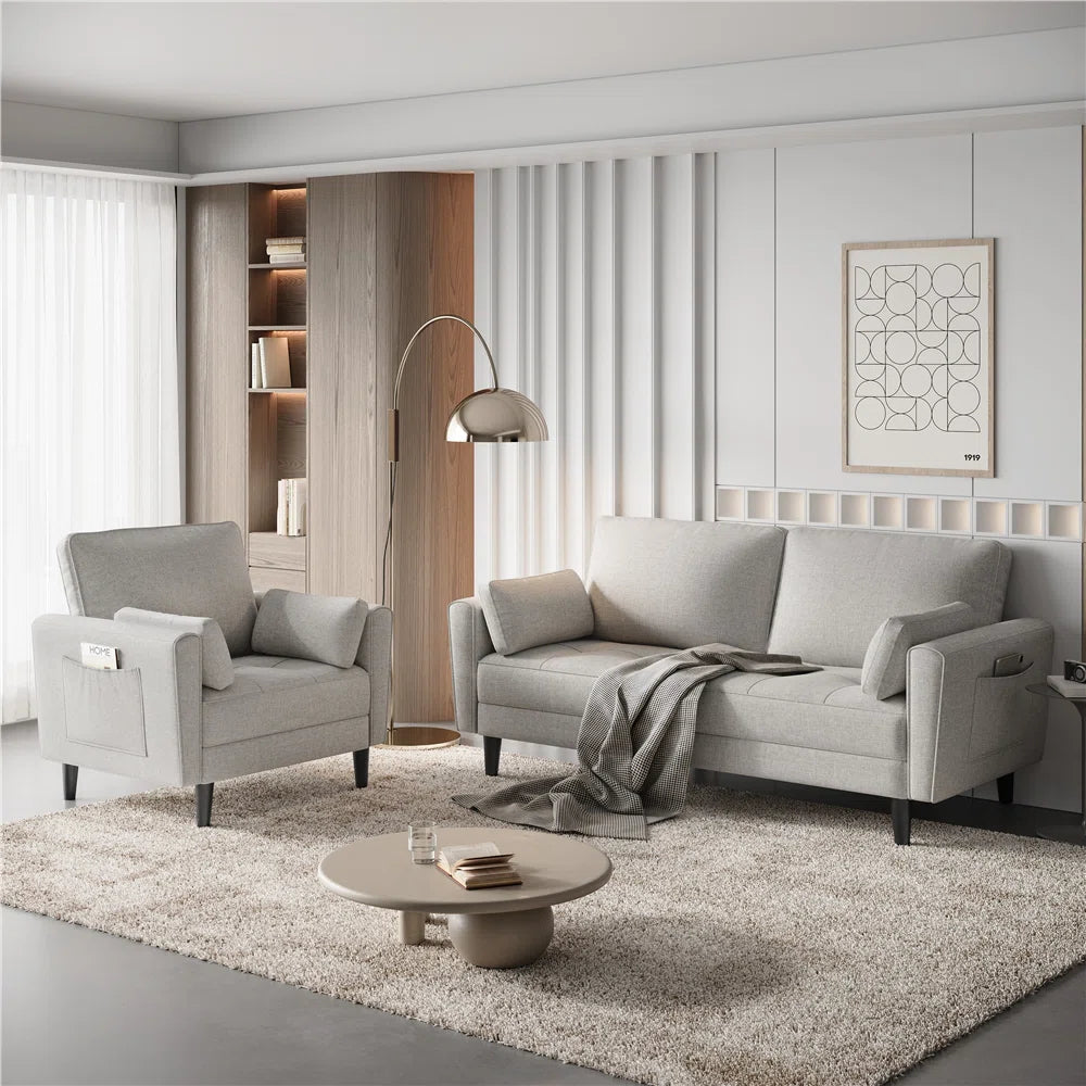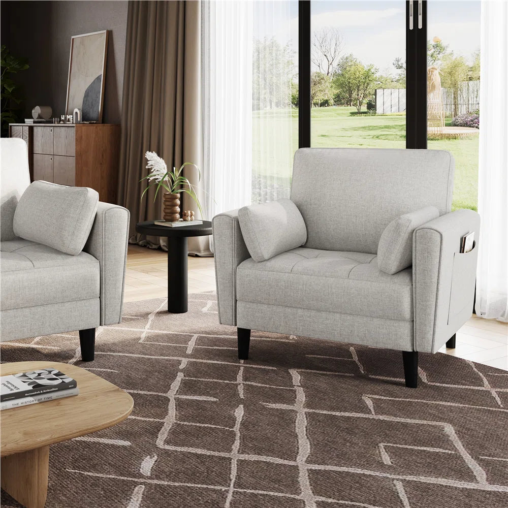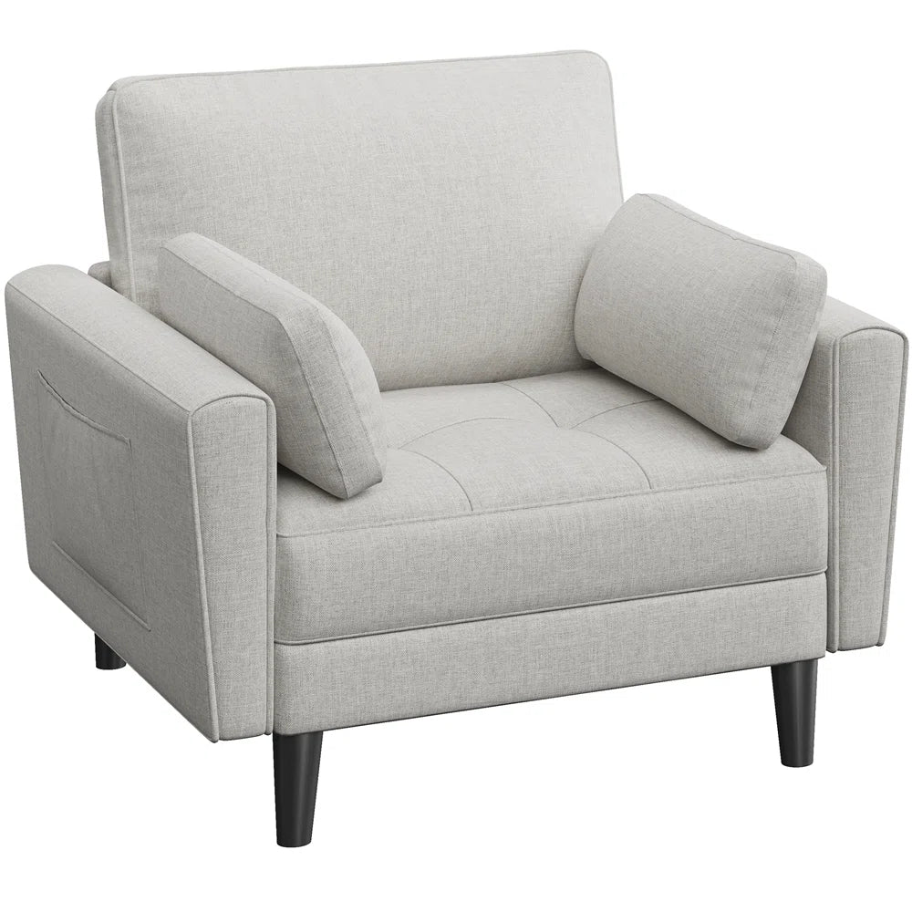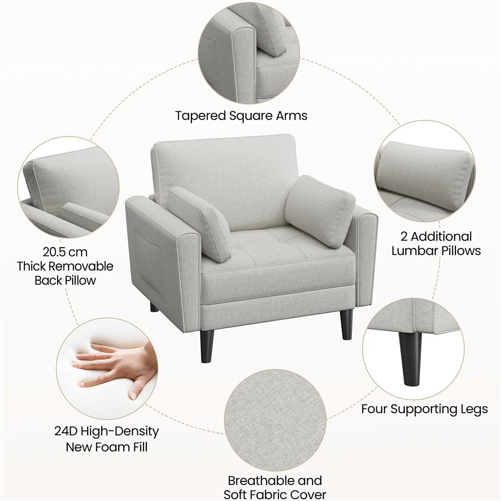 Crafted with modern aesthetics in mind, the Wendy Armchair features slim, slightly tapered track arms, a tufted seat, and a spacious design that exudes sophistication without compromising comfort. Added conveniences such as storage pockets on each armrest and easy-to-remove cushion covers make this chair both stylish and practical. With its roomy dimensions and timeless design, this armchair transforms any corner of your home into a cozy, chic retreat.