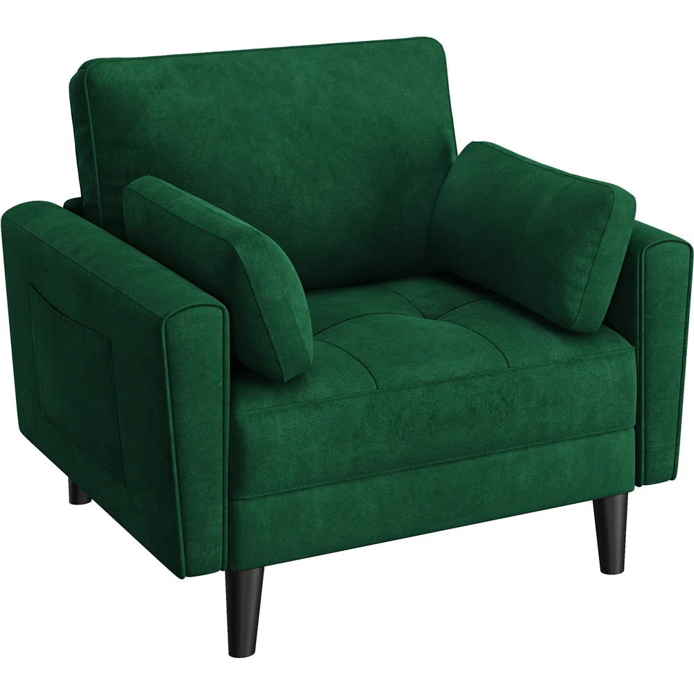 Crafted with modern aesthetics in mind, the Wendy Armchair features slim, slightly tapered track arms, a tufted seat, and a spacious design that exudes sophistication without compromising comfort. Added conveniences such as storage pockets on each armrest and easy-to-remove cushion covers make this chair both stylish and practical. With its roomy dimensions and timeless design, this armchair transforms any corner of your home into a cozy, chic retreat.